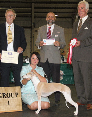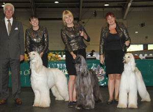 Judging for Best in Hound Group Judge: Mr Stuart Mallard BEST : 2488 MYCROFT, Mrs S & MYCROFT Miss F Supeta's Eclipse JW Sh.CMWHIPPETBitch RESERVE : 2215 THORN ANDREWS Mrs Z Drakesleat Fingers XrossedDACHSHUND (MINIATURE WIRE HAIRED)Bitch 3rd : 1912 ROBERTSON Mrs S Ch Soletrader Noble KinsmenBASSET GRIFFON VENDEEN (Petit)Dog 4th : 2295 BARNARD Mrs K Ch Jockular Lord Leonti At Tsjakka JW (Imp)RHODESIAN RIDGEBACKDog Mrs S Mycroft & Miss F Mycroft Supeta's Eclipse JW Sh.CM with group judge Mr S Mallard, Mr J Nixon (President) & Mr A Bongiovanni (Royal Canin)Mrs Z Thorn Andrews Drakesleat Fingers Xrossed with group judge Mr S MallardMrs S Robertson Ch Soletrader Noble Kinsmen with group judge Mr S MallardMrs K Barnard Ch Jockular Lord Leonti At Tsjakka JW (Imp) with group judge Mr S Mallard Hound Breeder GroupJudge: Mr Stuart Mallard 1st : Millward & Mottershaw - Afghan Hound 2nd : Antony - Beagle 3rd : Egan - Ibizan Hound 4th : Steer - Saluki Millward & Mottershaw - Afghan Hound with breeder group judge Mr S Mallard