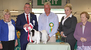 Mr R Smith & Mr M Coad Pamplona The Real Mccoy with puppy group judge Mrs D Stewart-Ritchie, Mrs S St. Maur Thorp (Assistant Secretary) & L Carter