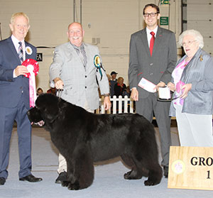 Mrs L Chapman & Mr T Chapman Ch Merrybear D' Artagnan with group judge Mr T Johnston, Mrs E Summers (Chief Steward) & Mr J Wolstenholme (Royal Canin)