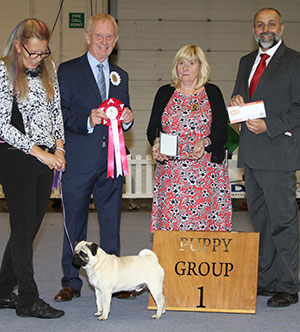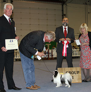 Mr A Allcock MBE Ch Sleepyhollow Robson JW Sh.CM with group judge Mr S Mallard, Mrs S St Maur Thorp (Asst Secretary) & Mr A Bongiovanni (Royal Canin)