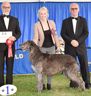 Mrs E Grayson Ch & Int Ch Tokaji American Gigolo at Embeau JW Sh with veteran group judge Mr J Walton-Haddon & Mr M Lancashire (Show Manager)