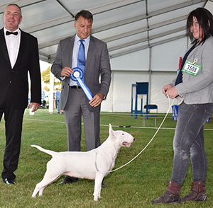 Mr S Morris & Miss D Heath Bluepoint Kittiwake with Mr M Young (Bull Terrier judge) & Mr R Thompson (Committee