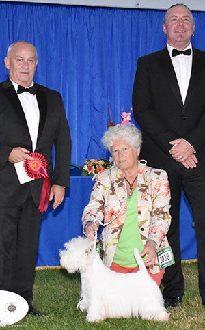 Mrs S Fryer Multi Ch Hopecharm Prince Harry (Imp) with veteran group judge Mr G Cox & Mr R Thompson (Committee)